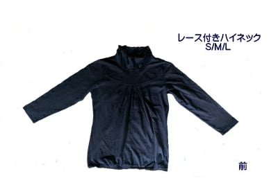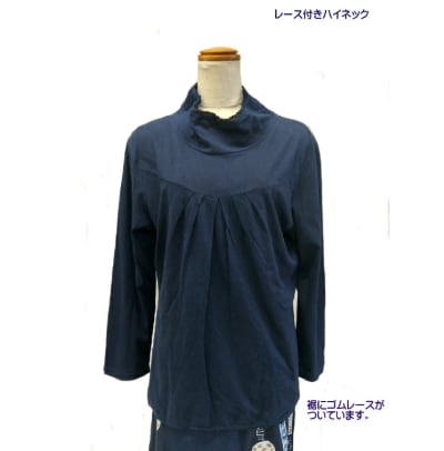 美しい藍染めが施されたカットソーは、レース付きのハイネックデザインで、シンプルながらも華やかさを演出します。重ね着や単独での着用にも適しており、さまざまなシーンで活躍します。